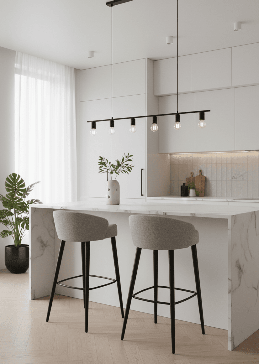 Miękkie, tapicerowane siedzisko zapewnia wygodę nawet podczas dłuższego siedzenia, idealne przy wysokiej wyspie kuchennej, w jadalnianej strefie barowej czy w domowym kąciku do spotkań.