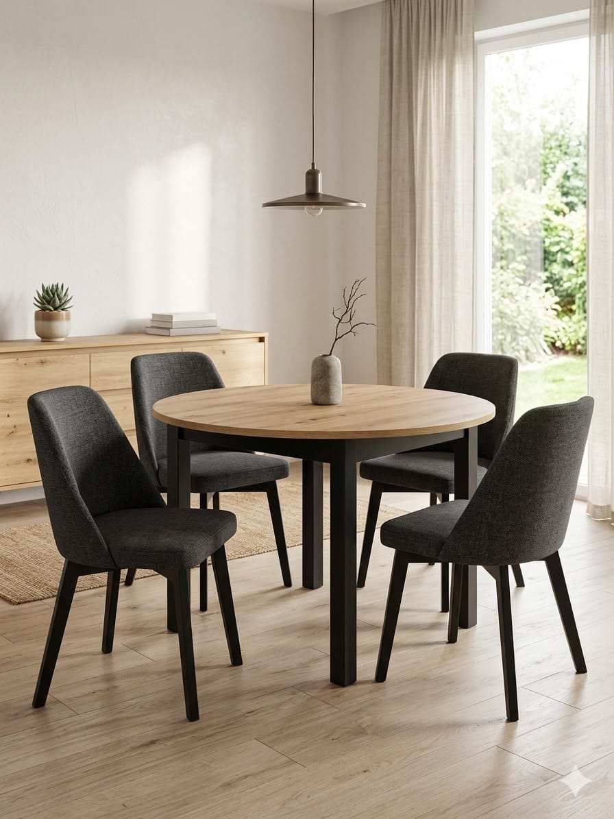 Stół ST44M to połączenie eleganckiej formy, funkcjonalnych rozwiązań i solidnego wykonania, które sprawdzi się w każdym wnętrzu. Okrągły kształt dodaje mu lekkości i tworzy przyjazną przestrzeń do wspólnych posiłków, rozmów i codziennych spotkań. Dzięki możliwości rozłożenia świetnie odnajdzie się zarówno w mniejszych, jak i większych pomieszczeniach.