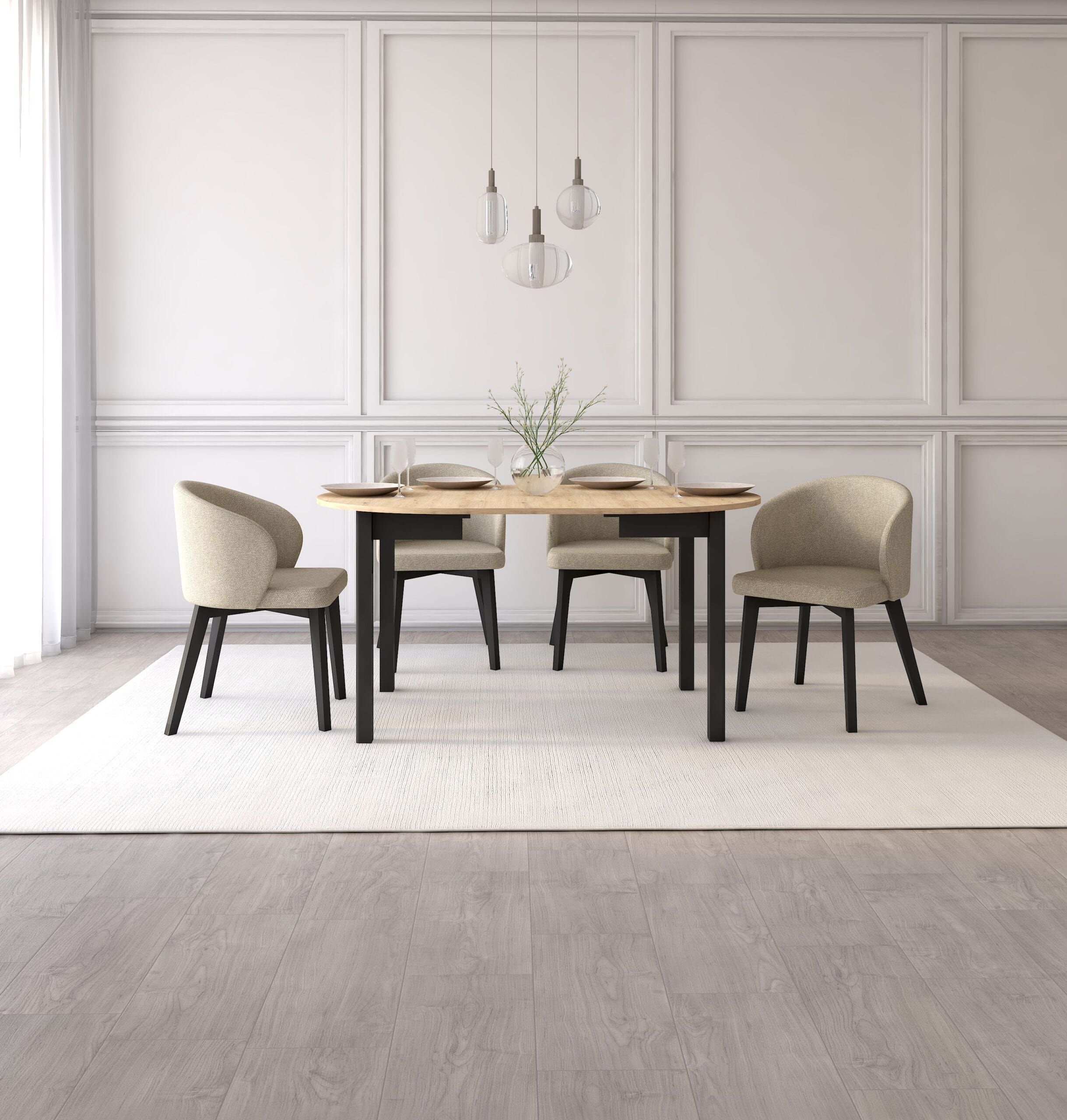 Nowoczesny, okrągły stół z funkcją rozkładania to propozycja dla osób, które szukają praktycznych rozwiązań i cenią dobry styl. Stół w kolorze dąb artisan w połączeniu z czarnymi nogami wnosi do wnętrza ciepło i harmonię, tworząc przyjazną przestrzeń do codziennych spotkań. Idealnie wpisuje się w styl skandynawski, nowoczesny oraz minimalistyczny, dodając wnętrzu elegancji. Komplet uzupełniają kubełkowe, tapicerowane krzesła, które zachwycają designem i komfortem użytkowania. Pięknie komponują się ze stołem stanowiąc spójny, elegancki zestaw, który odnajdzie się zarówno w jadalni, salonie czy kuchni. Razem tworzą spójne połączenie, które wprowadza do Twojego domu nie tylko funkcjonalność, ale także styl i przytulność, stając się miejscem codziennych chwil i spotkań.