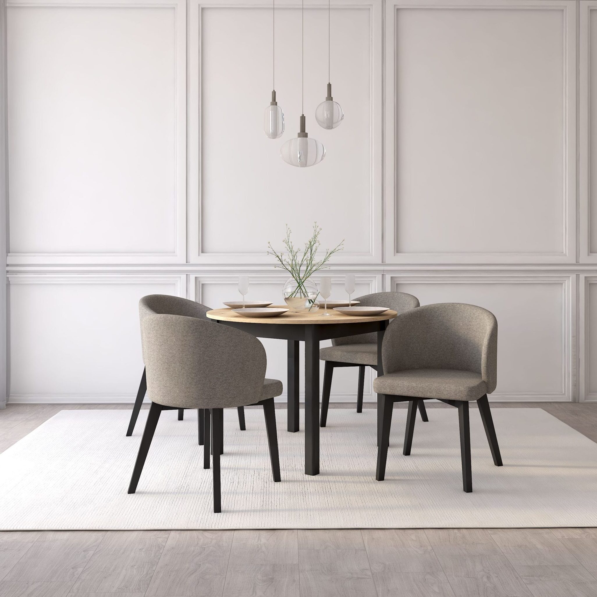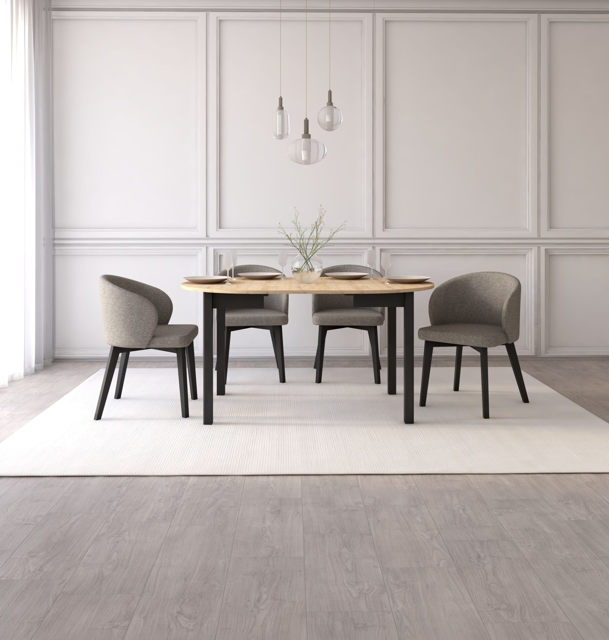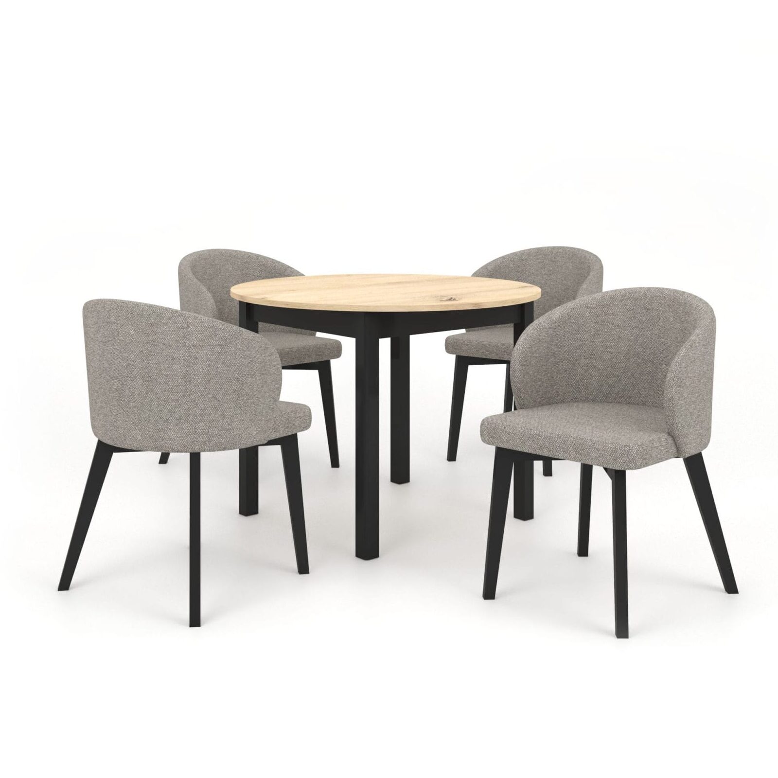Nowoczesny, okrągły stół z funkcją rozkładania to propozycja dla osób, które szukają praktycznych rozwiązań i cenią dobry styl. Stół w kolorze dąb artisan w połączeniu z czarnymi nogami wnosi do wnętrza ciepło i harmonię, tworząc przyjazną przestrzeń do codziennych spotkań. Idealnie wpisuje się w styl skandynawski, nowoczesny oraz minimalistyczny, dodając wnętrzu elegancji. Komplet uzupełniają kubełkowe, tapicerowane krzesła, które zachwycają designem i komfortem użytkowania. Pięknie komponują się ze stołem stanowiąc spójny, elegancki zestaw, który odnajdzie się zarówno w jadalni, salonie czy kuchni. Razem tworzą spójne połączenie, które wprowadza do Twojego domu nie tylko funkcjonalność, ale także styl i przytulność, stając się miejscem codziennych chwil i spotkań.